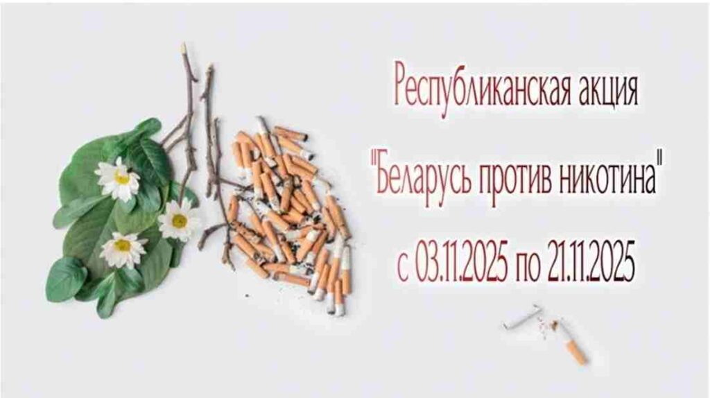 В целях повышения осведомленности по вопросам негативного влияния потребления никотинсодержащих и табачных изделий на здоровье, прежде всего, в контексте развития онкологических заболеваний, формирования у населения негативного отношения к потреблению табака и иной никотинсодержащей продукции, мотивации на ведение здорового образа жизни, в период с 03.11.2025 по 21.11.2025 будет проводиться республиканская информационно-образовательная акция «Беларусь против никотина» (далее – Акция). Данное мероприятие приурочено к Дню некурения, который проводится по инициативе Международного союза по борьбе с раком ежегодно в третий четверг ноября.