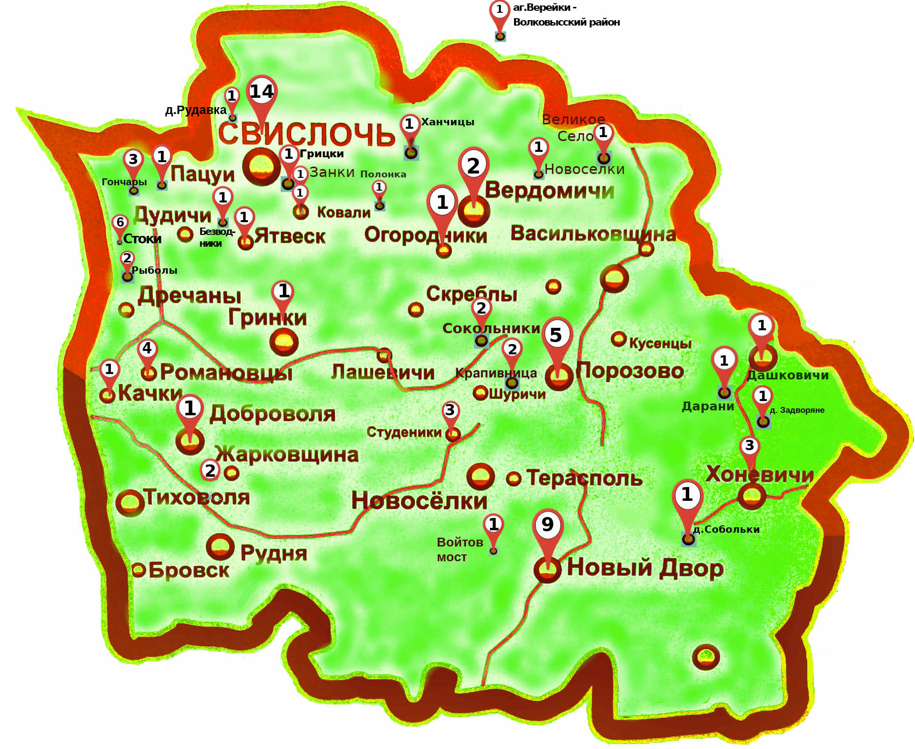 | ГУО «Детский сад №2 г. Свислочь» | городской парк г. Свислочь, ул. Дзержинского (ребенок) | г. Свислочь, ул. Пограничников (2) г.Свислочь, ул. Цагельник 2 ребенка) | аг. Новый Двор (5, из них 2 ребенока) | д. Стоки | д. Грицки | 18.04.2025 место погребения аг. Тиховоля Свислочского РУПЖКХ – 0,1 га |